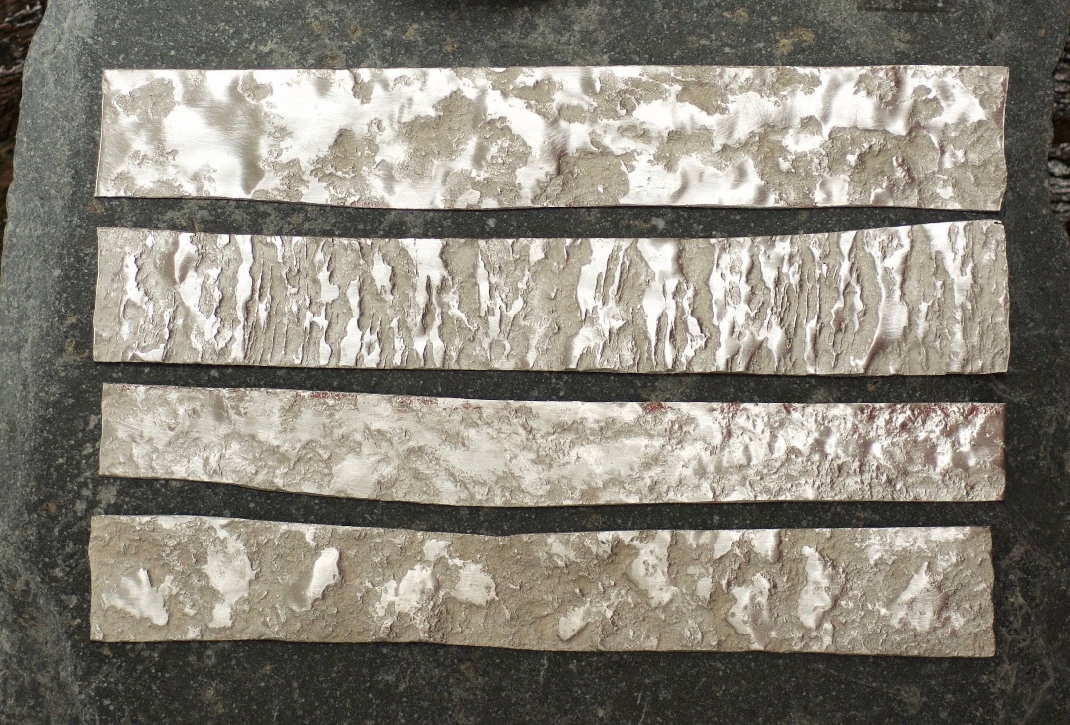It is a bit like sketching, working with the boulders and tors to imprint the unique quality of each carefully selected granite form. I try out a small area to see if I like the marks left in the silver surface then hammer a length of sheet metal to use at a later date.