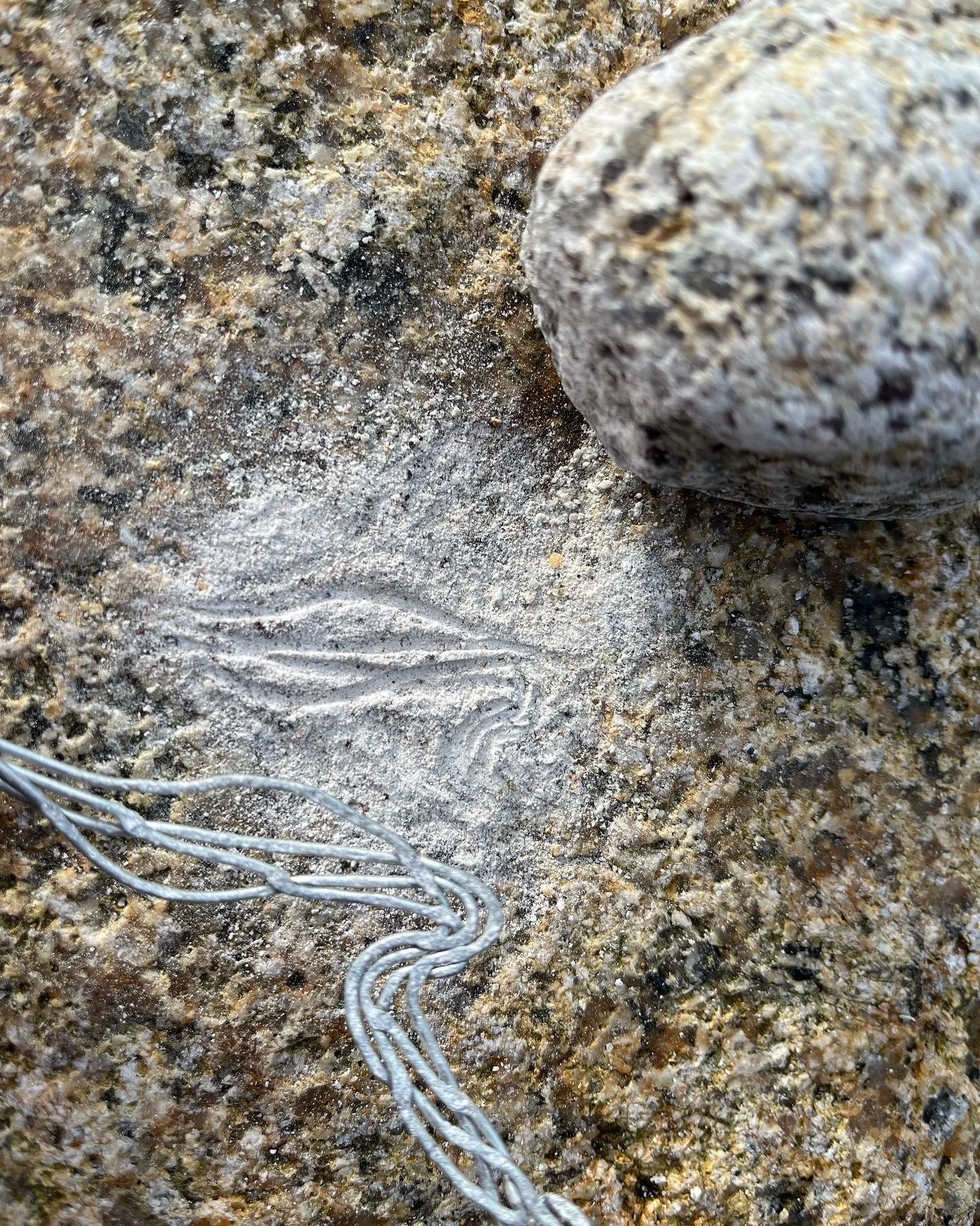 The new pieces are hammered against granite rocks, as you can see in the middle 3 images. The silver takes on the texture of the stone it’s hammered against so each piece is an imprint of a geological time capsule. I love this idea and that I am outside making the first markings on the silver.